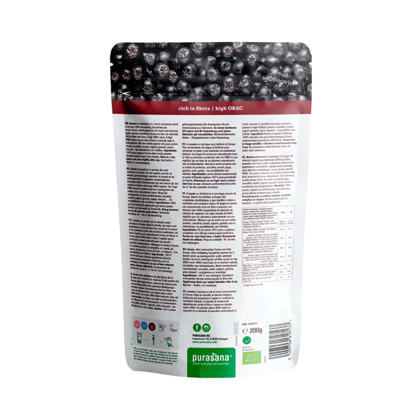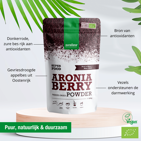 Purasana Aronia Bessen Poeder bevat 100% pure appelbes, zonder extra toevoegingen. Het product is gecertificeerd biologisch, vegan en koosjer, is bovendien vrij van de allergenen gluten, lactose en soja.