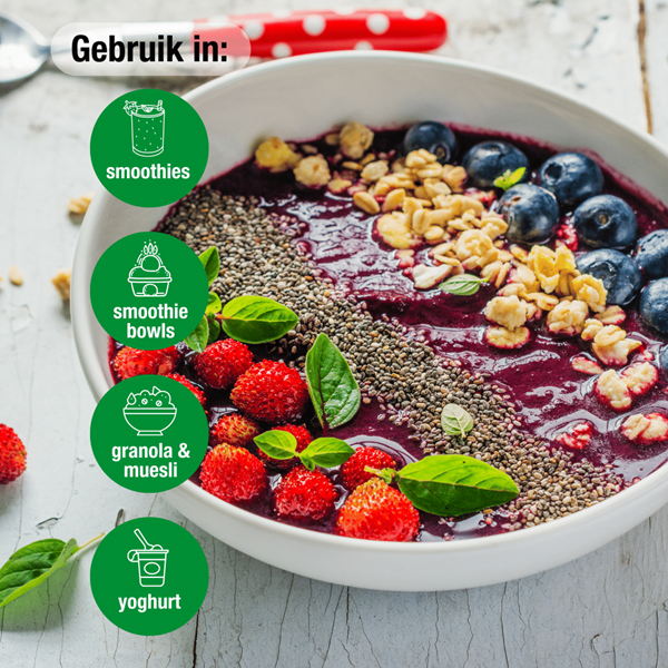 Voeg 5 g aronia poeder toe aan soja- of rijstdrank voor een shake boordevol antioxidanten. Met aroniapoeder geef je smoothies, sapjes, muesli, granola of yoghurt voor een aantrekkelijke paarse kleur en een lichtzure smaak. Geschikt voor dagelijks gebruik!