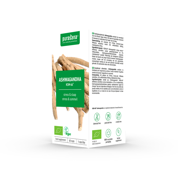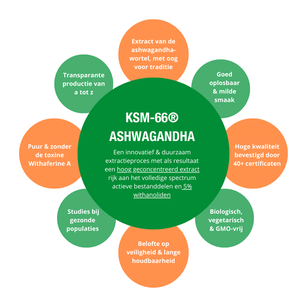 KSM-66 ashwagandha is een biologisch extract van de wortels van de ashwagandhaplant. Het bevat hoge concentraties withanoliden, dit zijn de actieve bestanddelen. Het bedrijf Ixoreal, dat KSM-66 produceert, garandeert de kwaliteit van het extract door middel van strenge landbouw-, productie- en verpakkingspraktijken. KSM-66 is erkend als veilig, geschikt voor vegetariërs en lang houdbaar.