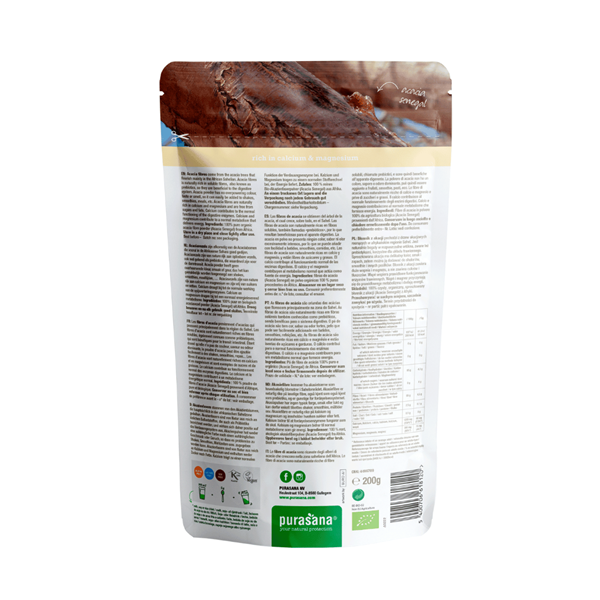 Purasana Acacia poeder bevat 100% pure acaciavezels, zonder extra toevoegingen. Het product is gecertificeerd biologisch, vegan en koosjer, is bovendien vrij van de allergenen gluten, lactose en soja.