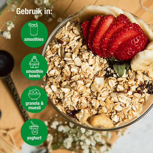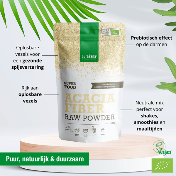 Acacia is rijk aan oplosbare vezels (4,5 g per portie van 5 g) die werken als prebiotica en bijdragen tot een gezonde darmtransit. Lees ook hoe acacia verschilt van psyllium.