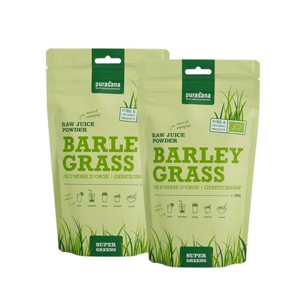 Het Purasana Barley Grass Juice Powder Duo Pack, afkomstig van jonge gerstscheuten, is een puur, groen poeder boordevol fytonutriënten.