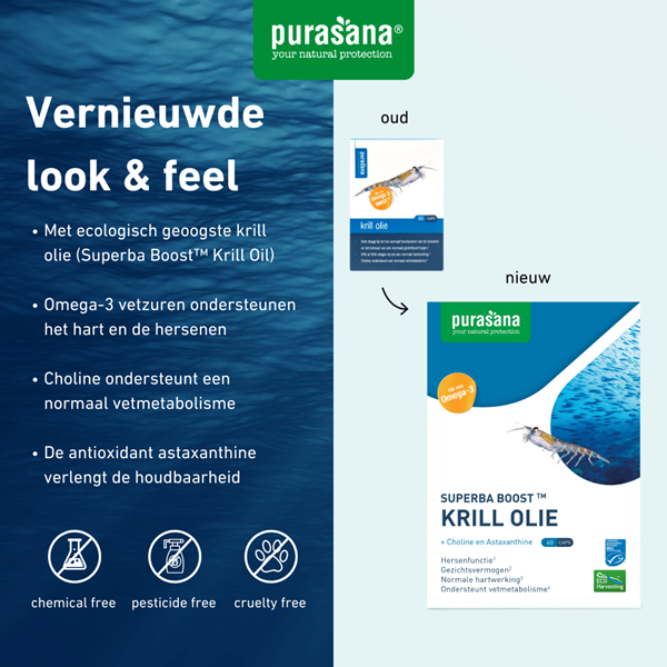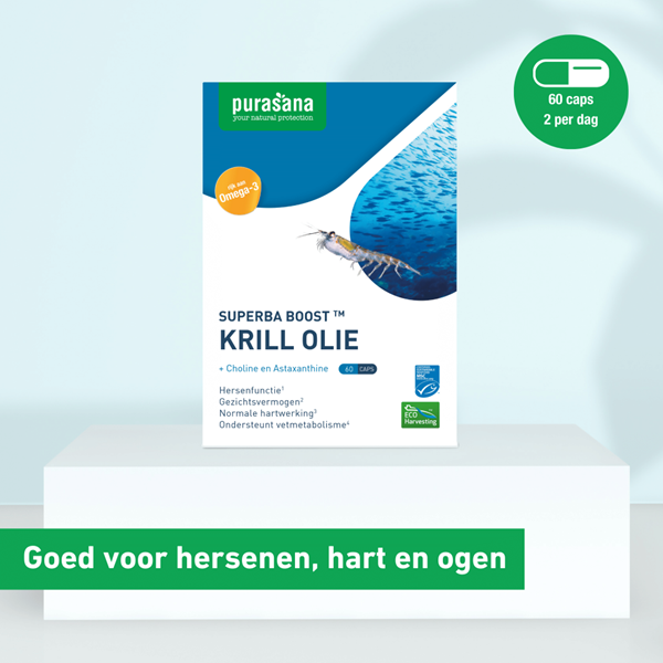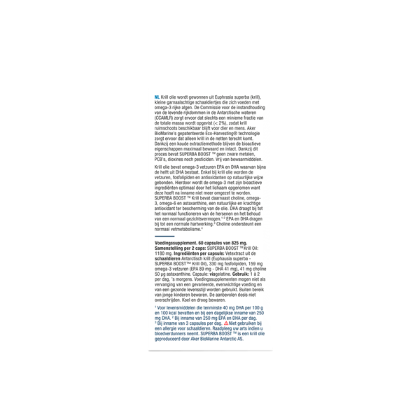 Voedingssupplement. 60 capsules van 825 mg. Samenstelling per 2 caps: SUPERBA BOOST TM Krill Oil (Noorwegen): 1180 mg. Ingrediënten per capsule: Vetextract uit de schaaldieren Antarctisch krill (Euphausia superba - SUPERBA BOOST™ Krill Oil), 330 mg fosfolipiden, 159 mg omega-3 vetzuren (EPA 89 mg - DHA 41 mg), 41 mg choline 50 µg astaxanthine. Capsule: visgelatine. Bevat schaaldieren en vis.