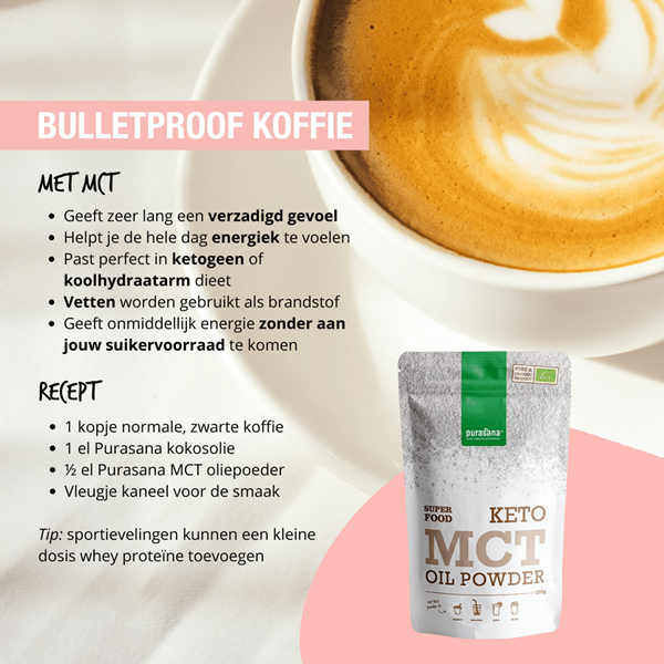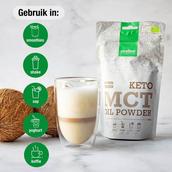 MCT's zijn interessant als je een ketogeen dieet volgt, Dit dieet bestaat uit veel vetten en weinig koolhydraten. Door het gebrek aan koolhydraten schakelt het lichaam over op vetverbranding. Dit proces, ook wel ketose genoemd, wordt ondersteund door MCT's. Daarom wordt MCT poeder vaak keto poeder genoemd.