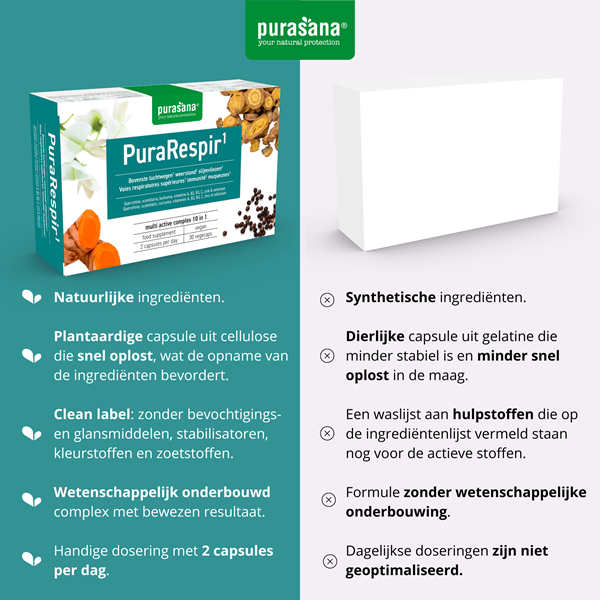 Daarnaast helpt PuraRespir bij het behoud van de weerstand en normale slijmvliezen, wat het lichaam helpt beschermen tegen bacteriën en virussen. De unieke werking op de luchtwegen, zorgt voor extra bescherming tegen luchtinfecties.