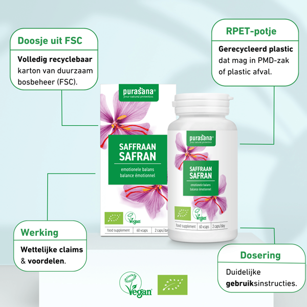 Neem dagelijks 2 capsules saffraan extract samen met een glas water bij de maaltijd. De timing maakt niet uit, je mag dit gerust 's avonds doen.