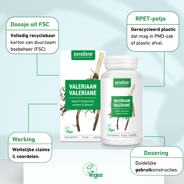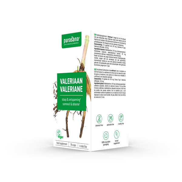 De valeriaanplant levert de verbinding valeriaanzuur dat prikkelbaarheid vermindert, bijdraagt tot een kalm gevoel en het lichaam helpt ontspannen. Verder draagt valeriaan bij tot een gezonde slaap en helpt het kruid om gemakkelijker in slaap te vallen.