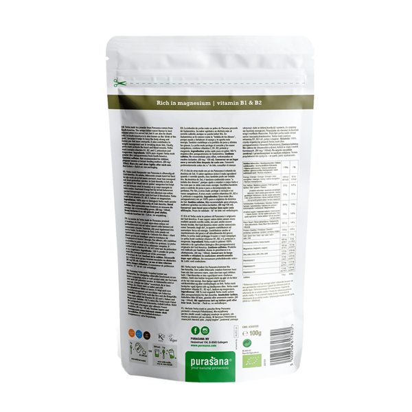 Purasana Yerba Maté Powder bevat 100% rauwe yerba maté, zonder extra toevoegingen. Het product is gecertificeerd biologisch, vegan en koosjer, is bovendien vrij van de allergenen gluten, lactose en soja.
