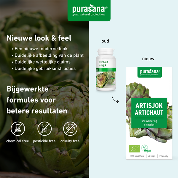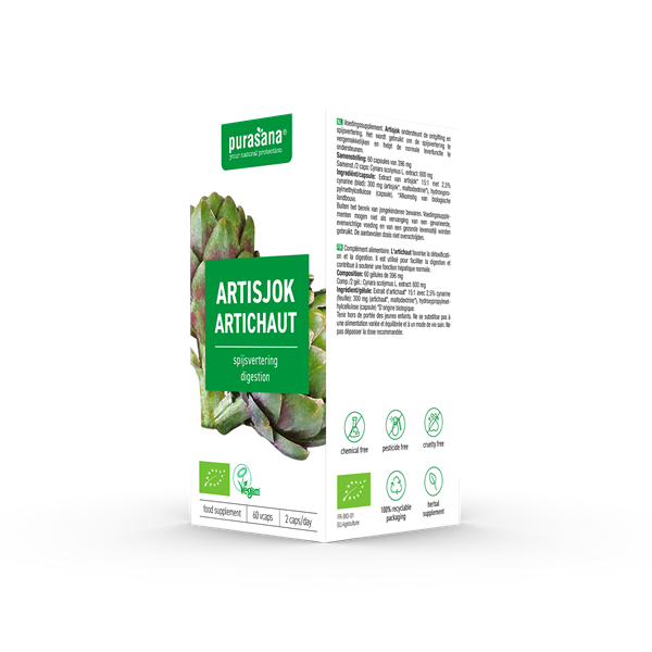 Artisjok is een plant met een eetbare bloemknop en zit vol met vitaminen, mineralen en vezels. Purasana gebruikt voor haar capsules de bladeren van de artisjokplant.