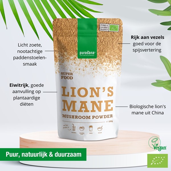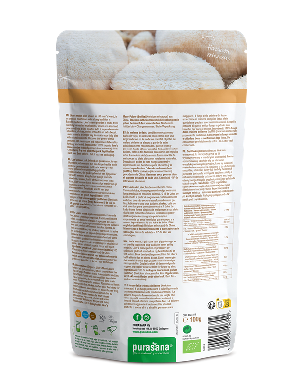 Het biologische poeder is afkomstig van het vruchtlichaam van de Lion's mane paddenstoel, zonder sporen. Hierdoor bevat het minimaal 3% polysachariden, goed voor een natuurlijke boost voor lichaam en geest.
