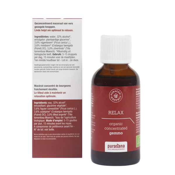 Puragem Relax bevat maceraten uit vijg, meidoorn en zilverlinde. Deze natuurlijke ingrediënten helpen je te ontspannen en om sneller in slaap te vallen. Zilverlinde en meidoorn helpen spanningen te verminderen. Meidoorn helpt sneller de slaap te vatten en een natuurlijke slaap te behouden.