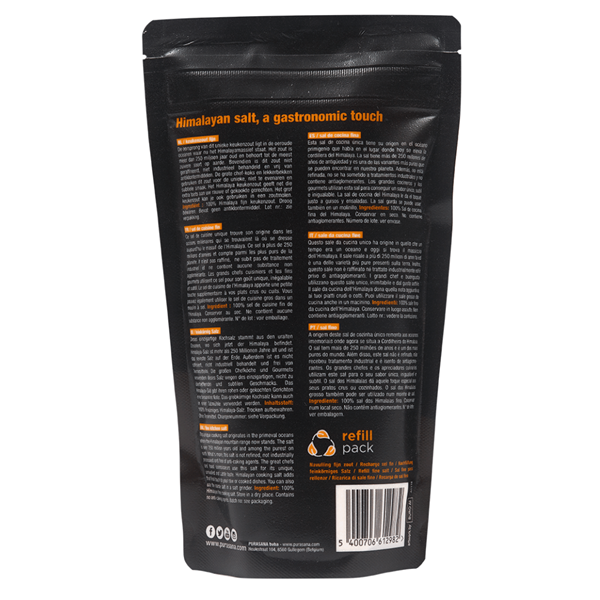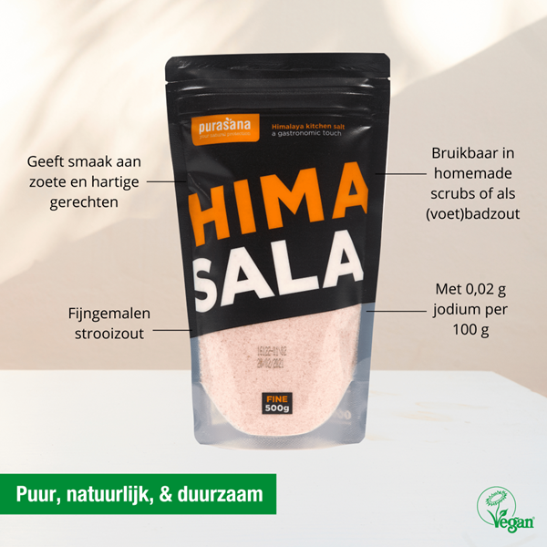 Purasana Himasala keukenzout geeft je gerechten een verfijnde smaaktoets en bestaat zowel uit fijne als grove korrel. Je kunt Himalayazout naar smaak over koude en warme gerechten strooien en door smoothies, desserts en ander lekkers roeren.