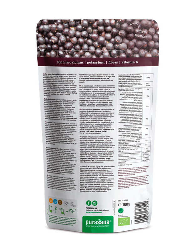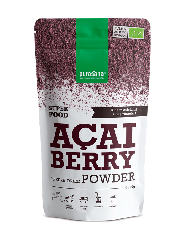 Açaibessen zijn rijk aan voedingsstoffen die dankzij een speciaal vriesdroogproces behouden worden. Zo komt 20 kg bessen overeen met 1 kg acai poeder.