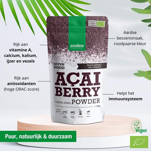 Purasana gevriesdroogd Acai Poeder bevat 100% pure acai, zonder extra toevoegingen. Het product is gecertificeerd biologisch, vegan en koosjer, is bovendien vrij van de allergenen gluten, lactose en soja.