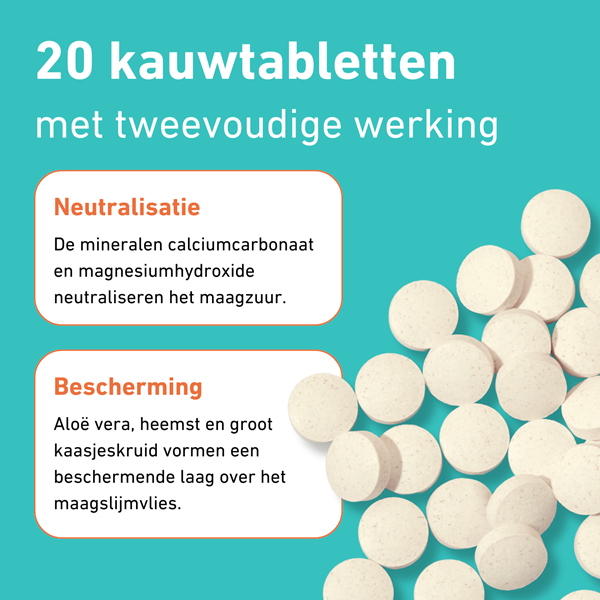 - Calciumcarbonaat en magnesiumhydroxide neutraliseren het overtollige maagzuur en verlichten zo de symptomen van zuurbranden.