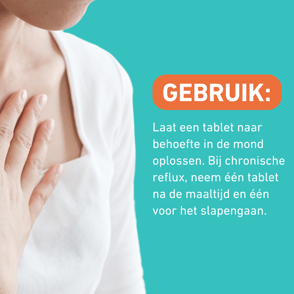 Laat een kauwtablet langzaam in de mond oplossen wanneer je een maagzuuraanval krijgt of reflux optreedt. Bij chronische reflux kan één tablet na de maaltijd en één voor het slapengaan worden ingenomen. Het product is veilig voor langdurig gebruik en kan meerdere keren per dag worden ingenomen.