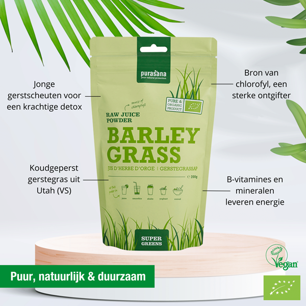 Purasana Gerstegrassappoeder bevat 100% koudgeperste scheuten van de jonge gerstplant, zonder extra toevoegingen. Het product is gecertificeerd biologisch, vegan en koosjer, is bovendien vrij van de allergenen gluten, lactose en soja.