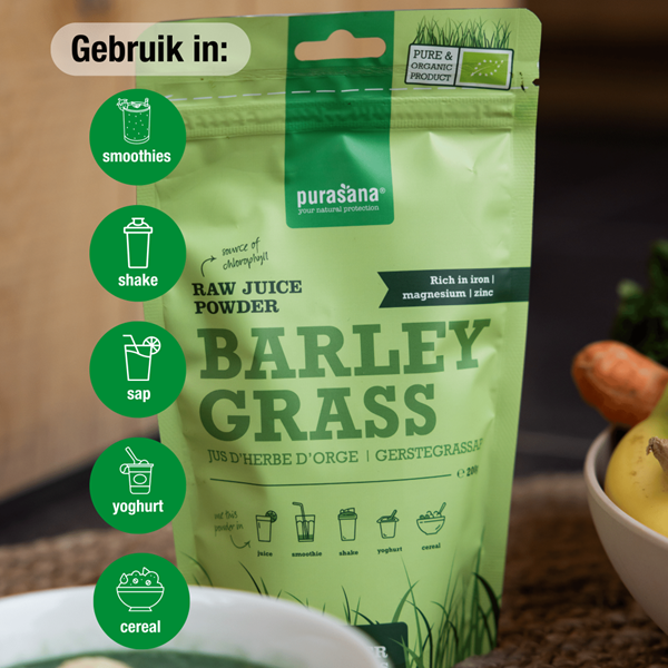 Heel gezond! Het poeder van gerstegrassap levert aanzienlijke hoeveelheden vitamine B1, B1, kalium, calcium, fosfor, magnesium, ijzer en zink. Daarnaast is gerstegras een goede bron van de ontgifter chlorofyl.