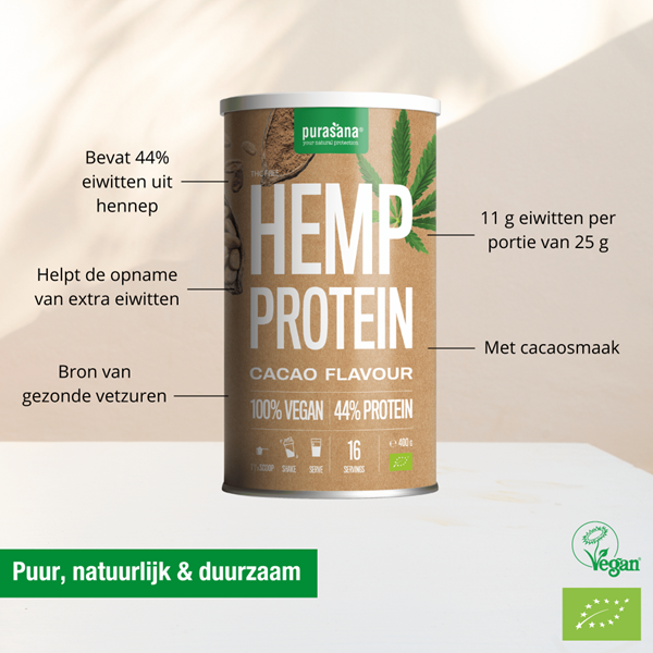 Cacao hennep eiwitpoeder heeft een fijne textuur en een nootachtige cacaosmaak. Liever hemp protein dat neutraal van smaak is? Probeer dan Vegan hennepproteïne naturel.