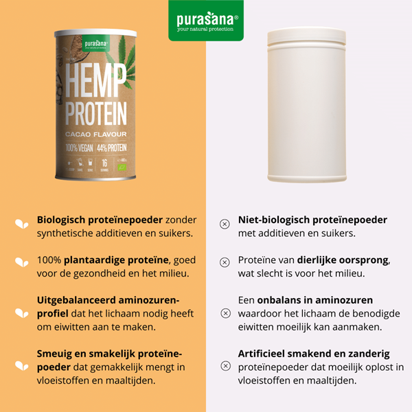 Hennep eiwitpoeder is een plantaardig poeder, gemaakt van de veelzijdige Cannabis Sativaplant. Purasana's Vegan Hemp Protein Cacao wordt geproduceerd na een koude persing van gepelde hennepzaden.