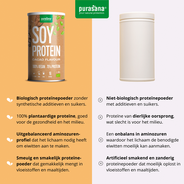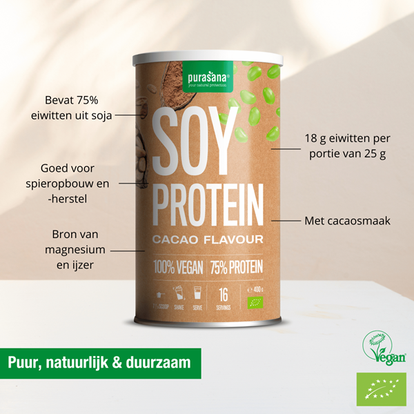 Purasana's Soy Protein Cacao levert 75% eiwitten uit soja. Het proteïnepoeder is puur en natuurlijk, en bevat geen synthetische additieven.