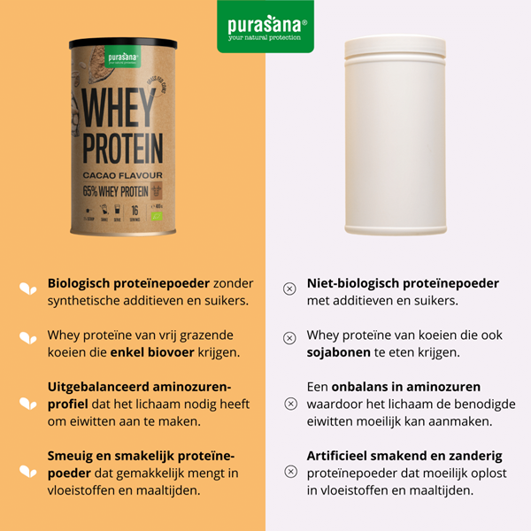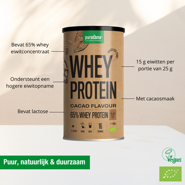 Purasana's whey is een gefilterd en hooggeconcentreerd poeder afkomstig van biologische runderen dat bestaat uit 65% eiwitten uit whey eiwitconcentraat.