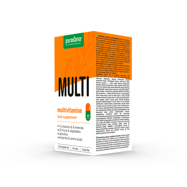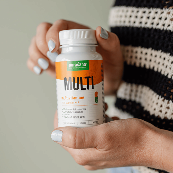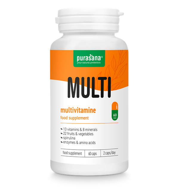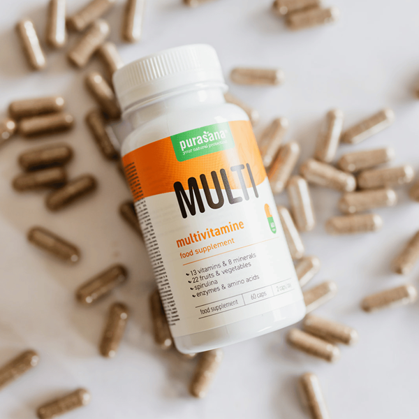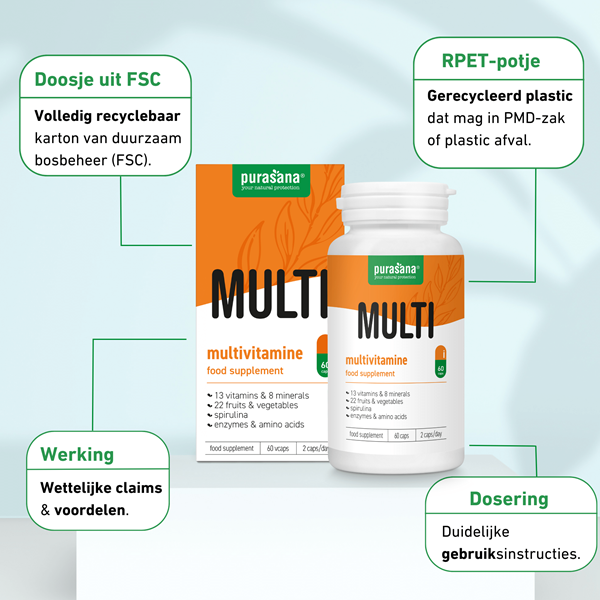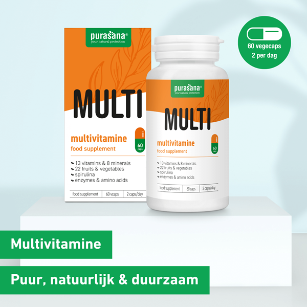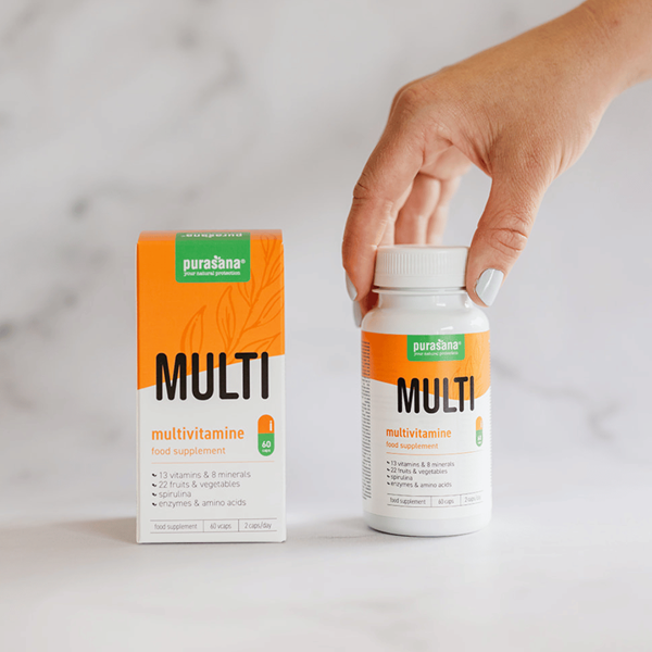 Een goede multivitamine herken je door de ingrediëntenlijst te bekijken. Wat bovenaan de lijst staat zit er in het meest in, wat onderaan staat het minst. Als er op de eerste plaats een vulstof staat, dan kan je deze multivitamine beter vermijden. Purasana’s multivitamine bevat de voedingsstoffen die je lichaam nodig heeft, zonder hulpstoffen. De stoffen die zorgen voor de houdbaarheid van de multivitamine zijn afkomstig van fruit, groente of planten.