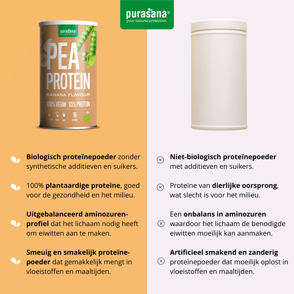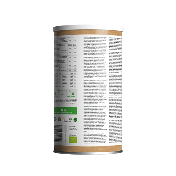 Purasana's Vegan Protein Powder Pea is gemaakt van puur erwteneiwit isolaat (65%) afkomstig van gele spliterwten.