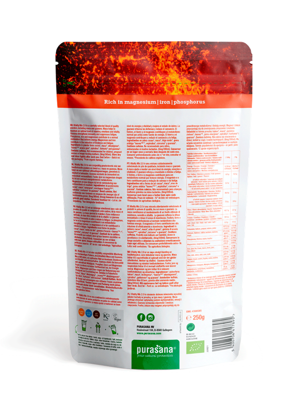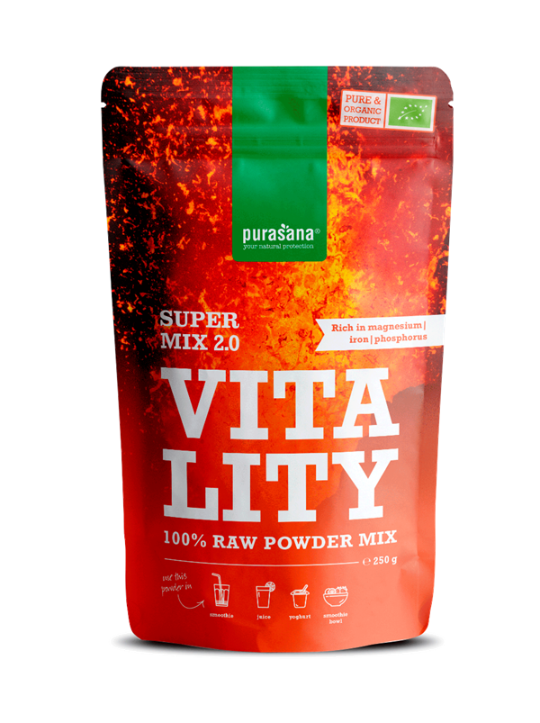 Vitality Mix 2.0 is een zorgvuldig geselecteerde mix van kwaliteitsvolle poeders en bevat o.a. maca en guarana. Maca helpt om een optimaal uithoudingsvermogen, gevoelens & vitaliteit te behouden. Guarana versterkt de immuniteit en onderdrukt vermoeidheid. Fosfor, ijzer en magnesium dragen bij tot een normaal energieleverend metabolisme. Magnesium en ijzer dragen bij tot de vermindering van vermoeidheid en moeheid.
