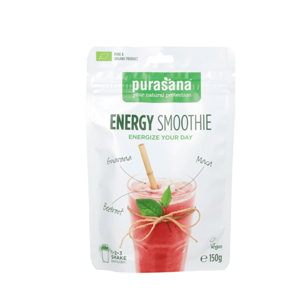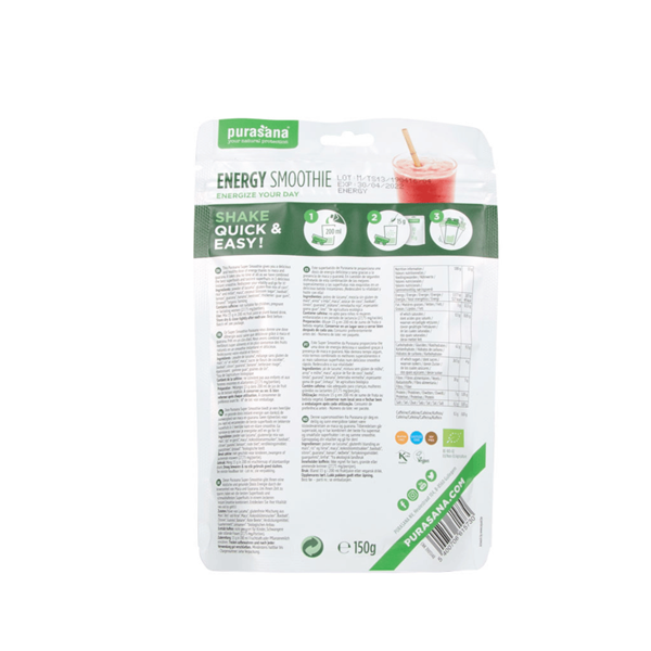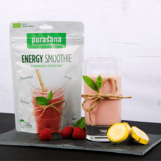 Purasana Energy Smoothie bevat een combinatie van maca, guarana, baobab, lijnzaad en lucuma.