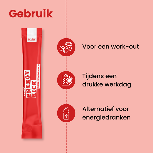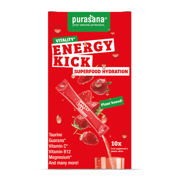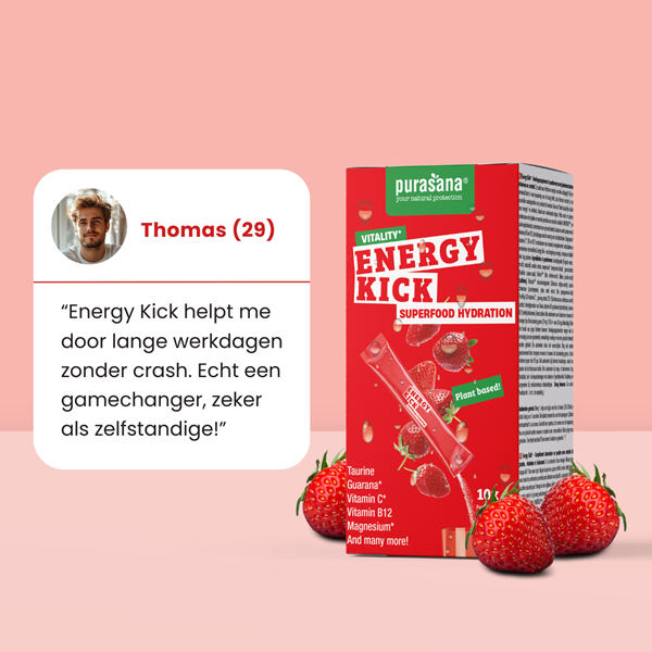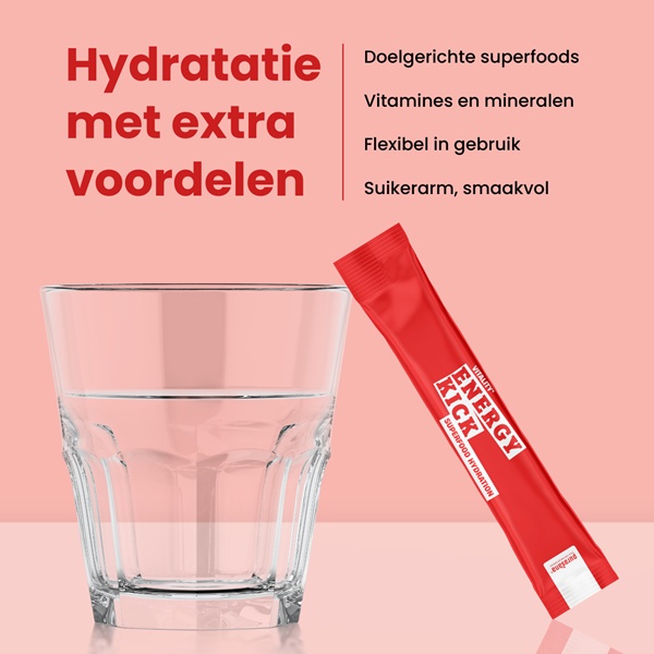 Energy Kick is goed voor een langdurige energieboost zonder crash dankzij adaptogenen en plantenextracten. Gun jezelf vandaag nog een natuurlijke energieboost met dit superfood hydratatiepoeder. Makkelijke on-the-go sticks met oppeppend aardbeiaroma!