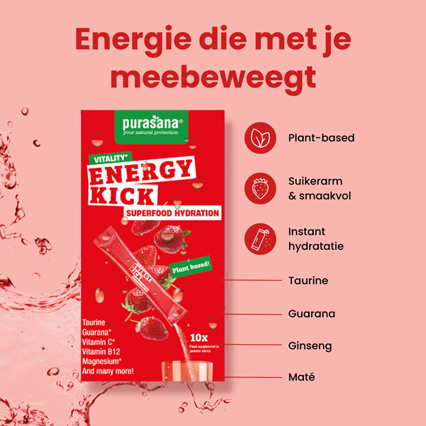 Purasana Energy Kick bevat 100% natuurlijke ingrediënten, zonder synthetische toevoegingen. Het product is vrij van toegevoegde suikers, soja en lactose.