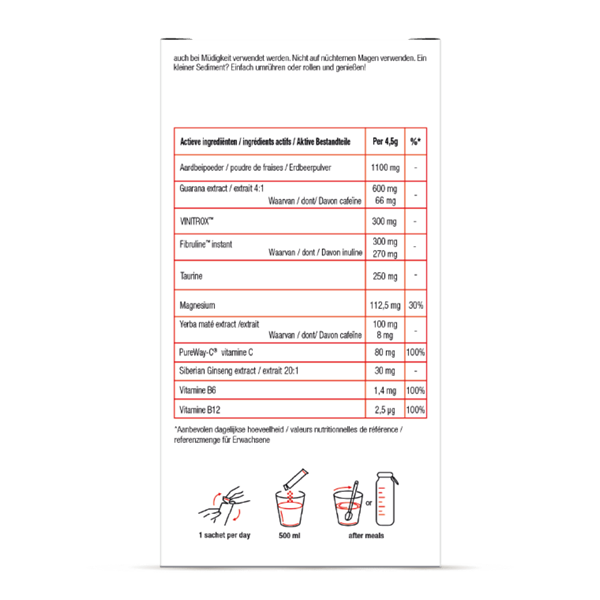 Aardbeipoeder (Fragaria vesca - vrucht), natuurlijk aardbeiaroma, magnesium (magnesiumcitraat), guarana-extract (Paullinia cupana-zaad), Vinitrox™ (Vitis vinifera-vrucht, Malus domestica-schil) (sulfieten), Fibruline™ chicoreivezelpoeder (Cichorium intybus-wortel), taurine, citroenzuur (zuurteregelaar), yerba maté-extract (Ilex paraguariensis-blad), PureWay-C® vitamine C, ginseng-extract 20:1 (Panax ginseng-wortel), zoetstof: steviolglycosides van Stevia, vitamine B6 (pyridoxine hydrochloride), vitamine B12 (methylcobalamine).