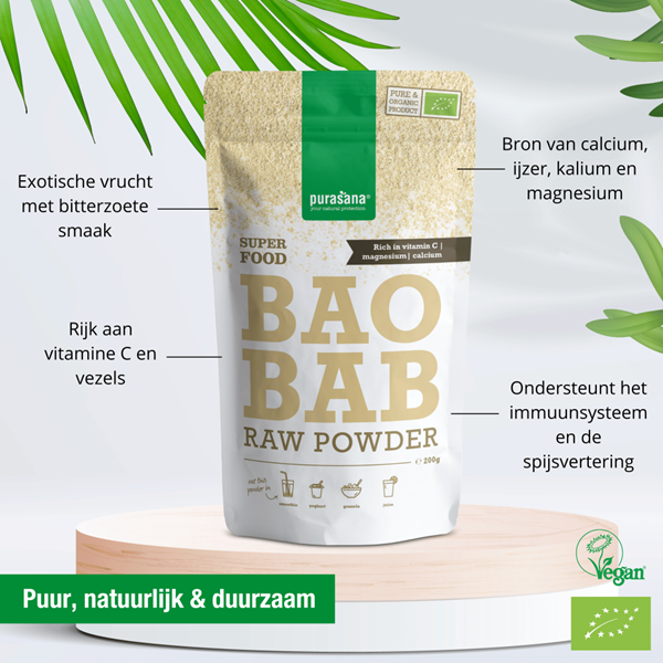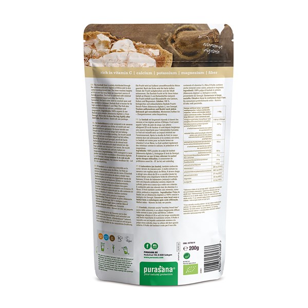 Purasana Baobab Poeder bevat 100% pure baobab, zonder extra toevoegingen. Het product is gecertificeerd biologisch, vegan en koosjer, is bovendien vrij van de allergenen gluten, lactose en soja.