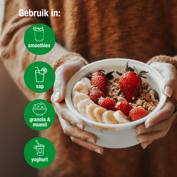 Boabab poeder heeft een bitterzoete smaak en is ideaal om toe te voegen aan smoothies, sappen, yoghurt, granola of hummus. Een schepje van 5 g mengen door 300 ml doet de klus. Ook geliefd bij kinderen!