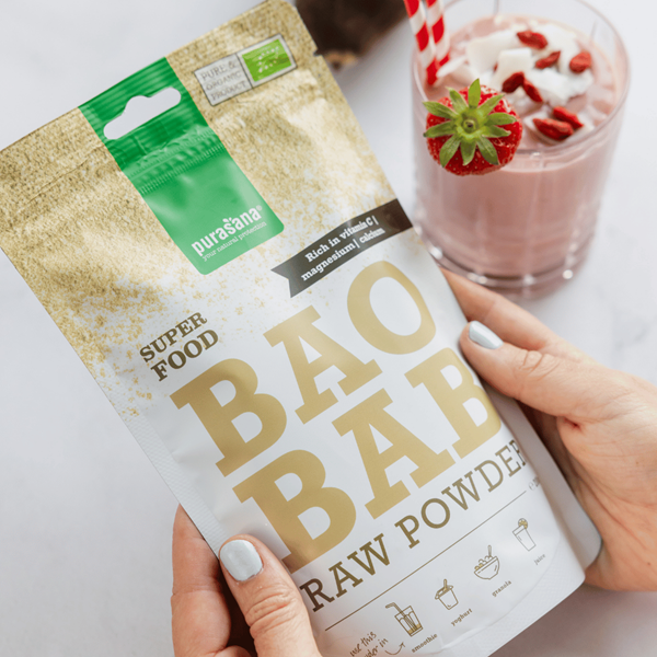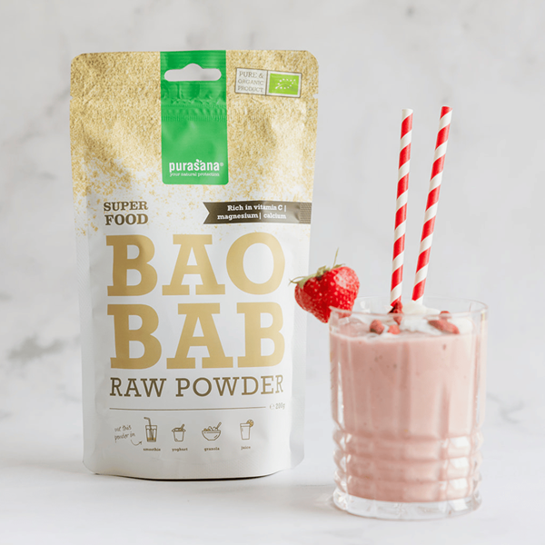 De baobab, ook wel apenbroodboom genoemd, komt voor in de savanne en drogere gebieden van Afrika. De boom bereikt een hoogte van 20 meter en draagt vruchten die erg gezond zijn. Zo is de baobab vrucht een natuurlijke bron van vezels, vitamine C, magnesium en calcium.