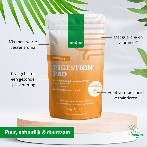 Wat ook kan helpen is meer goede bacteriën, enzymen en vezels aan je voedingspatroon toe te voegen. Digestion Pro Energy levert deze ingrediënten in een unieke superfood mix.