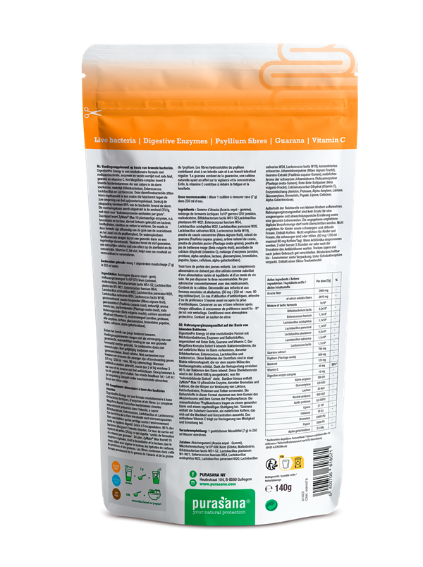 Energy levert ook oplosbare vezels uit acacia en niet-oplosbare vezels uit psyllium. Vezels nemen water op en geven volume aan de ontlasting, wat bijdraagt tot een een gezonde spijsvertering. Goede bacteriën in je darm zijn dol op vezels, daarom zijn ze ook nuttig voor de darmflora.