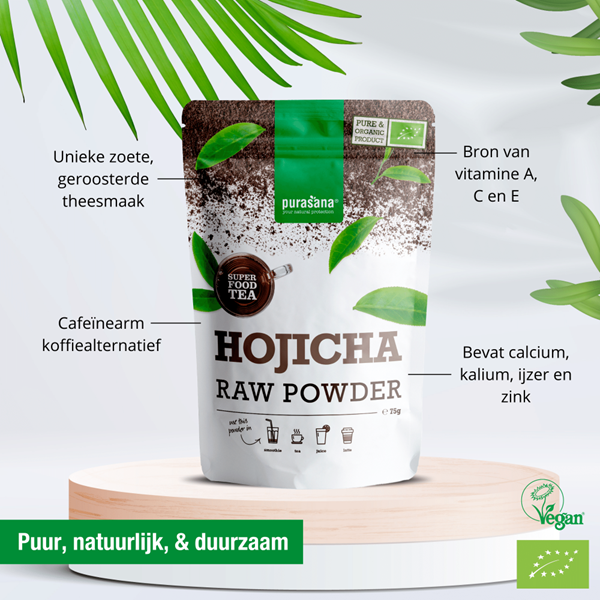 Purasana Hojicha Powder bevat 100% rauwe hojicha, zonder extra toevoegingen. Het product is gecertificeerd biologisch, vegan en koosjer, is bovendien vrij van de allergenen gluten, lactose en soja.