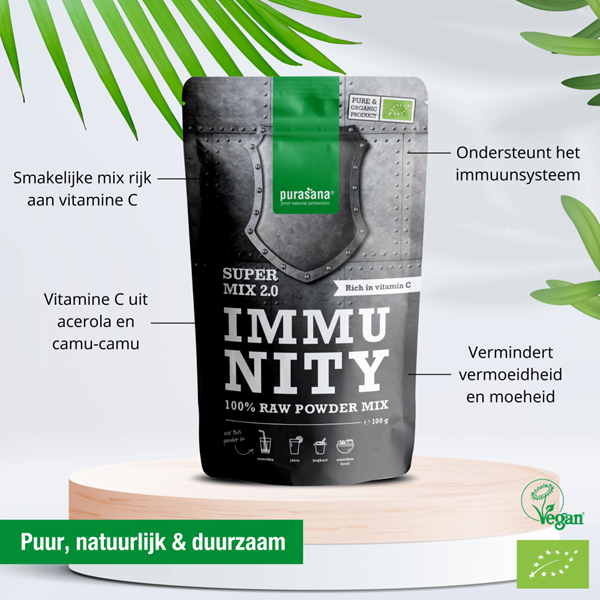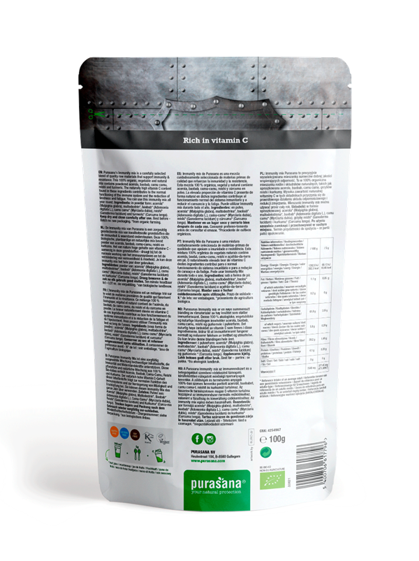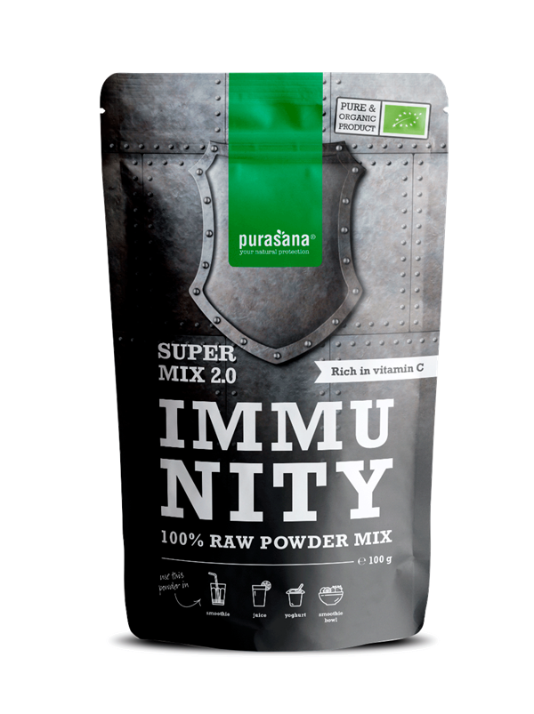 De Immunity mix van Purasana is een zorgvuldig geselecteerde mix van kwaliteitsvolle grondstoffen die de immuniteit & weerstand ondersteunen. Deze 100% biologische, plantaardige en natuurlijke mix bevat poeder van acerola, baobab, camu-camu, reishi en kurkuma. Het van nature hoge gehalte aan vitamine C - aanwezig in deze grondstoffen - draagt bij tot de normale werking van het immuunsysteem en tot de vermindering van vermoeidheid & moeheid. Je kan deze immunity mix het hele jaar door gebruiken.