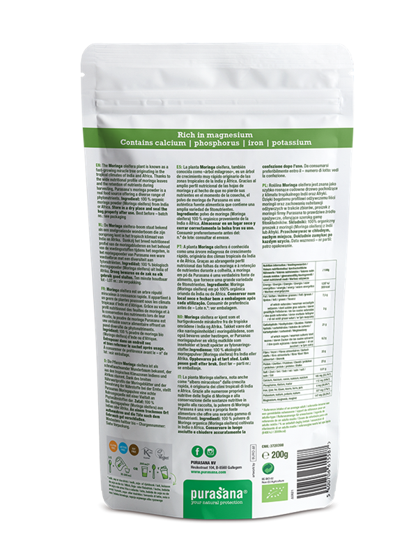 Purasana Moringa Poeder bevat 100% rauwe moringa, zonder extra toevoegingen. Het product is gecertificeerd biologisch, vegan en koosjer, is bovendien vrij van de allergenen gluten, lactose en soja.