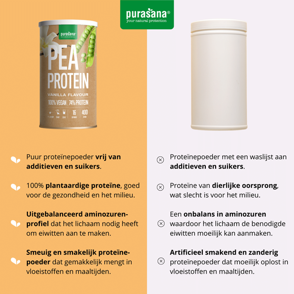 De vegan erwt eiwitpoeder met vanille helpt op een 100% plantaardige manier bijdragen aan het behoud en de groei van spiermassa. De toegevoegde kokosbloesemsuiker zorgt niet alleen voor smaak, maar ook voor de energievoorziening in het lichaam.