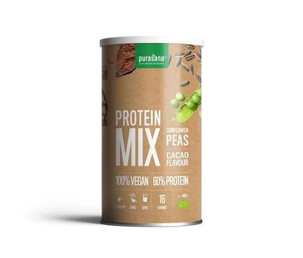 100% biologisch en plantaardig eiwitpoeder op basis van erwten- en zonnebloemeiwit met de heerlijke smaak van pure cacao. Deze mix bevat enkel pure en natuurlijke ingrediënten en geen synthetische additieven.