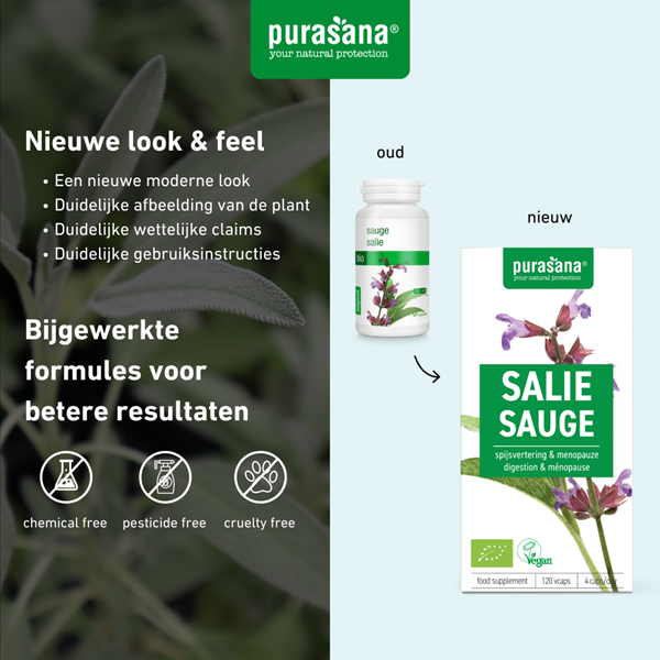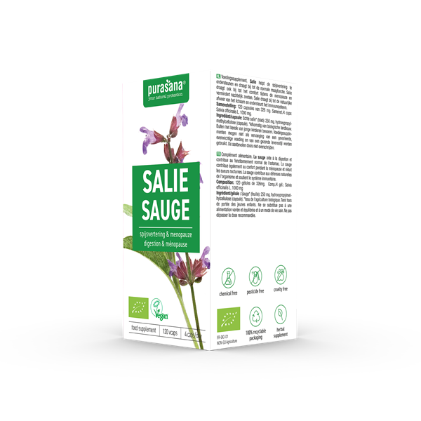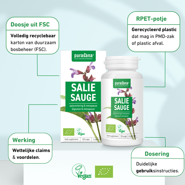 Echte salie* (blad uit Frankrijk, Albanië of Marokko): 250 mg, hydroxypropylmethylcellulose (capsule) *Afkomstig van biologische landbouw.
