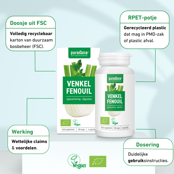 Venkel (vrucht, Frankrijk)*: 250 mg hydroxypropylmethylcellulose (capsule) *Afkomstig van biologische landbouw.