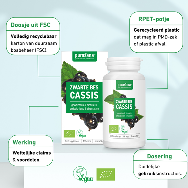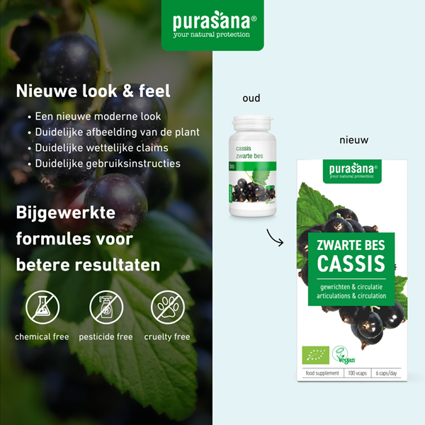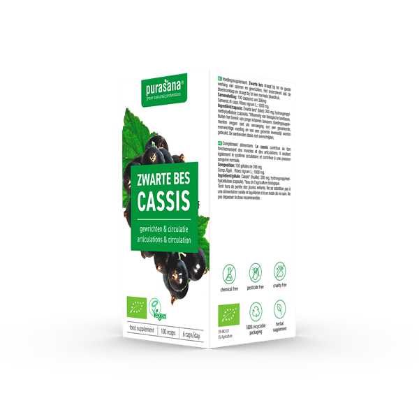 Purasana's capsules bevatten de bladeren van de zwarte bes die bijdragen tot de goede werking van de spieren en gewrichten. Ook ondersteunt zwarte bes de bloedsomloop en een normale bloeddruk.