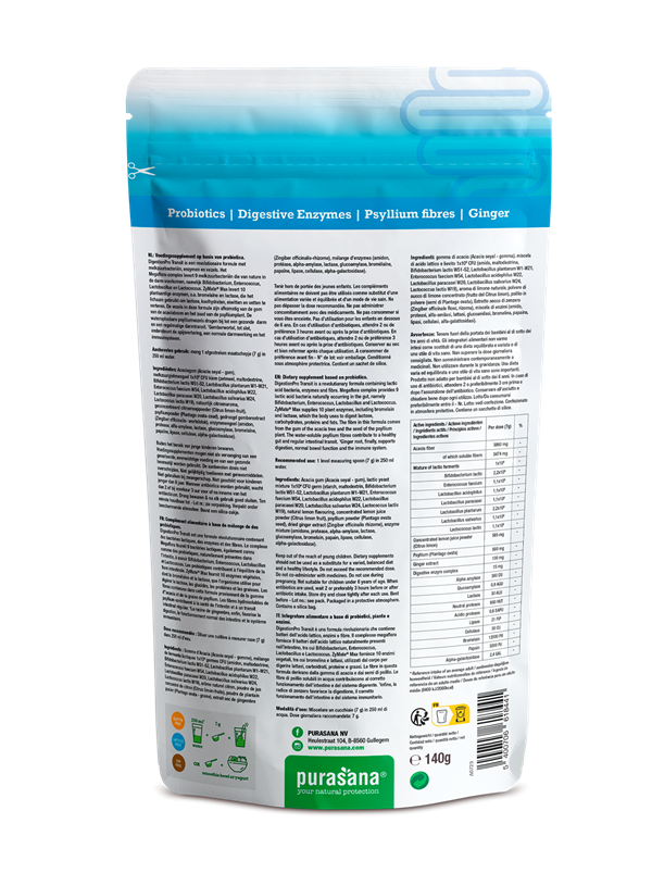 Digestion Probiotics Transit is vrij van bewaarmiddelen, synthetische ingrediënten, allergenen en kleurstoffen. Purasana streeft ernaar altijd zo dicht mogelijk bij haar natuurlijke origine te blijven. Kleurverschillen in dit product zijn het gevolg van natuurlijke factoren en hebben geen invloed op de kwaliteit of werking.