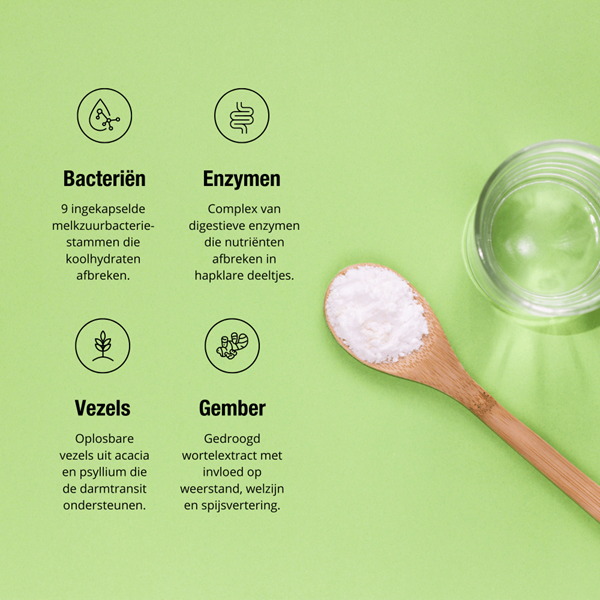Acaciagom (Acacia seyal - gom), melkzuurgistmengsel 1x109 CFU kiem (zetmeel, maltodextrine, Bifidobacterium lactis W51-52, Lactobacillus plantarum W1-W21, Enterococcus faecium W54, Lactobacillus acidophilus W22, Lactobacillus paracasei W20, Lactobacillus salivarius W24, Lactococcus lactis W19), natuurlijk citroenaroma, geconcentreerd citroensappoeder (Citrus limon-fruit), psylliumpoeder (Plantago ovata-zaad), gedroogd gemberextract (Zingiber officinalis- wortelstok), enzymmengsel (amidon, protease, alfa-amylase, lactase, glucoamylase, bromelaïne, papaïne, lipase, cellulase, alpha-galactosidase).