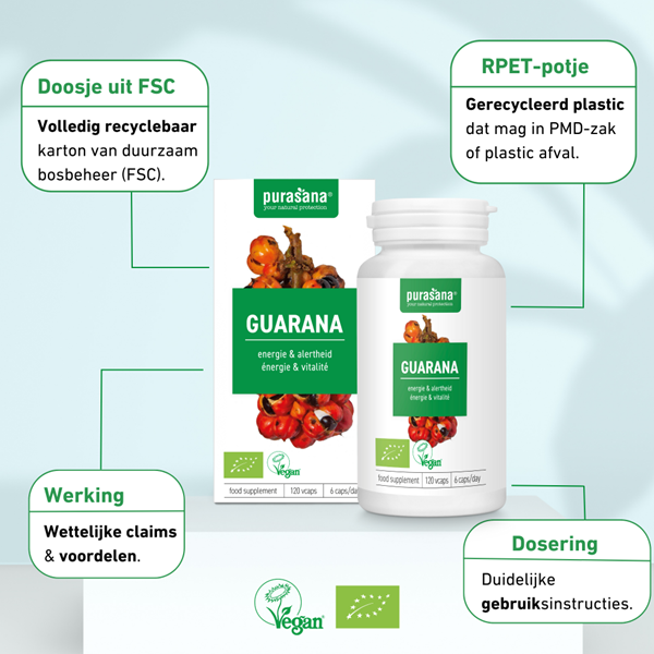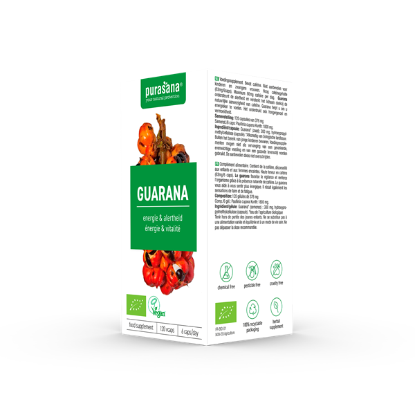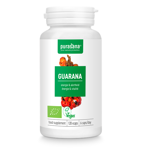 Guarana heeft een hoog cafeïnegehalte (63 mg/6 caps). Nuttig maximum 80 mg cafeïne per dag.