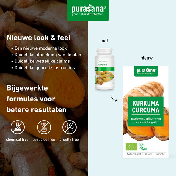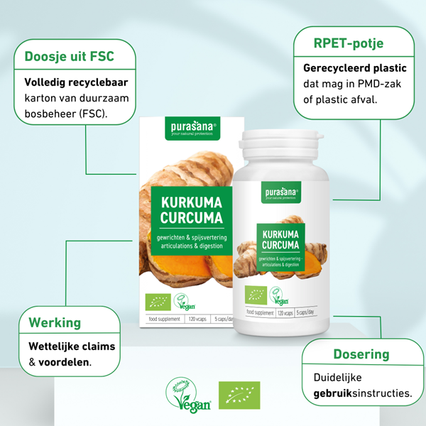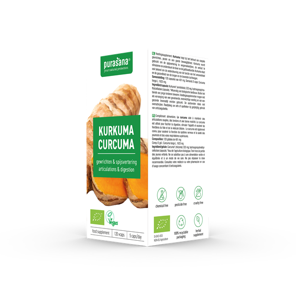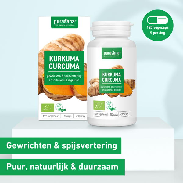 Kurkuma* (wortelstok, India): 325 mg, hydroxypropylmethylcellulose (capsule) *Afkomstig van biologische landbouw.